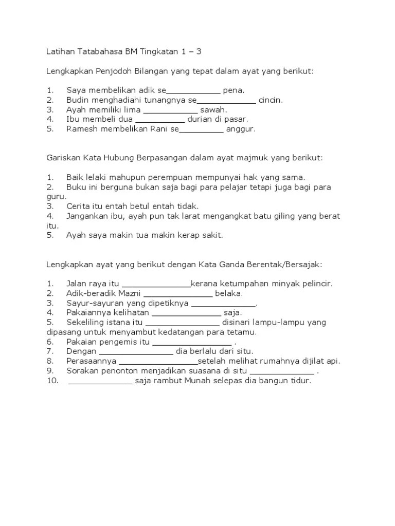 Tatabahasa Tingkatan 2 Latihan - Nota Pola Ayat. Tatabahasa tingkatan 2 latihan 2. Latihan bahasa melayu tingkatan 2 + jawapan. Bahasa melayu (bm) tingkatan 2 (pt3). Latihan cuti sekolah (bahasa melayu) tingkatan 2. Play this game to review world languages. Latihan tatabahasa online worksheet for tingkatan 2. Dalam setiap ayat di bawah terdapat satu kesalahan ejaan.